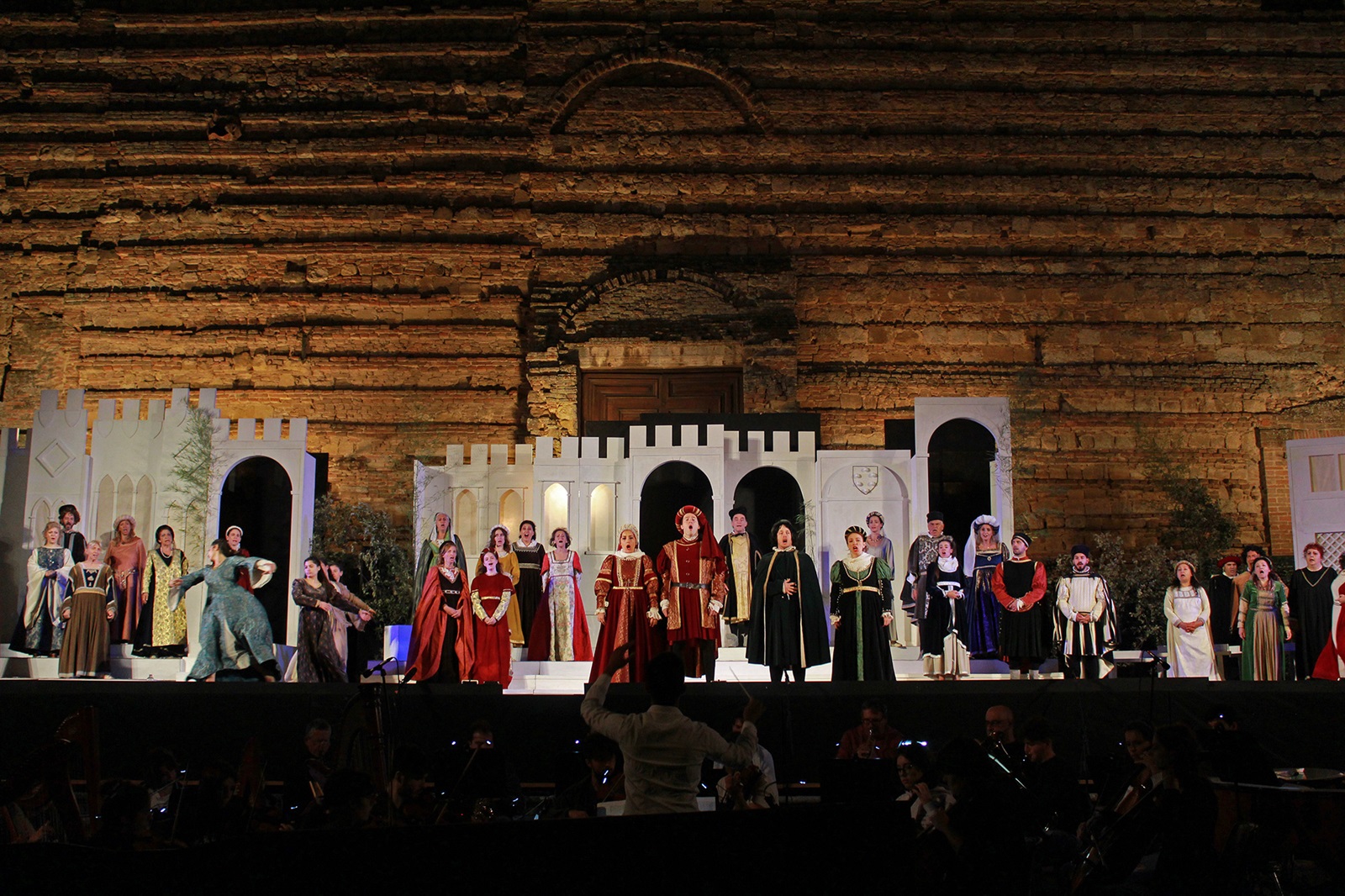 Bruscello has its tradition in ancient times. The name can be traced back to the sapling, the tree under which the song of the old storytellers recounted the deeds of characters dear to the memory of the people of the countryside and the villages that hosted popular festivals. In Montepulciano there is memory of Bruscello dating back to the 1800s; in the twenties we find it in a more spectacular form by some young Poliziani and in 1939 it was precisely that group that managed to involve the entire people of Poliziano in a spectacular Bruscello: “Pia de’ Tolomei”, conceived and created in the large natural stage of Piazza Grande: the churchyard of the Cathedral. The natural scene of the old villages and countryside is transformed into large castles and colonnades specially built by the craftsmen of Poliziani. The natural light of the sun is reproduced with lighting systems that recreate the settings necessary for the stories that are represented. The basket containing the rags is replaced by costumes specially made by local seamstresses, giving greater depth to the show that was evolving. The monotonous hendecasyllables in ottava rima, underlined by the sound of an accordion, are modernized, becoming quatrains of septenaries or verses in a leaner meter, capable of giving greater rhythm to the show with the accompaniment of an orchestra. The music, arrhythmic and atonal, becomes melody, stornello, serenade. The stories that are represented are those known to the people: stories related to the Royals of France and the dramas of the characters told by Dante in his Comedy; stories of characters of our tradition and legends, but also farce, joke and mockery soon find space in the Bruscello Poliziano, dramatized and divided into scenes and acts, as in the great popular operas.