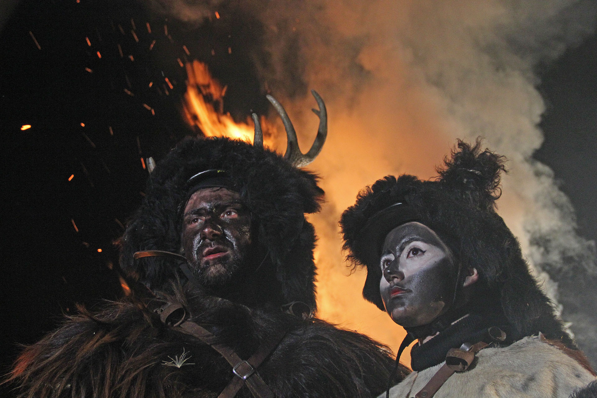 The gloomy and silent atmosphere of the winter evening is ripped open by the tinkling of cowbells. The Janare, the witches, arrive, accompanied by Maone. Together they perform a dance around a fire announcing the ritual that is about to take place. Then, all of a sudden, there he is. He can already be glimpsed in the crowd. The Stag arrives, creating disorder and disarray. He is followed by the doe, no less mighty and enraged.