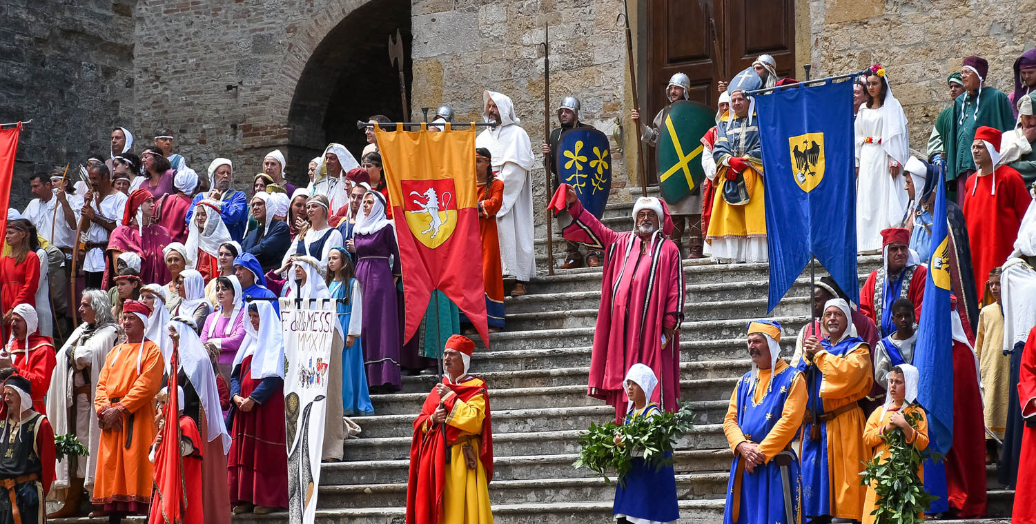 The Ferie delle Messi is a historical event that takes place in the streets and squares of the city, with the setting up of vintage stalls and arts and crafts related to the Middle Ages. During the event, the town comes alive with performances by storytellers, musicians and actors. During the afternoon of Sunday there will be a parade of knights and foot figures in costume and a knightly tournament.