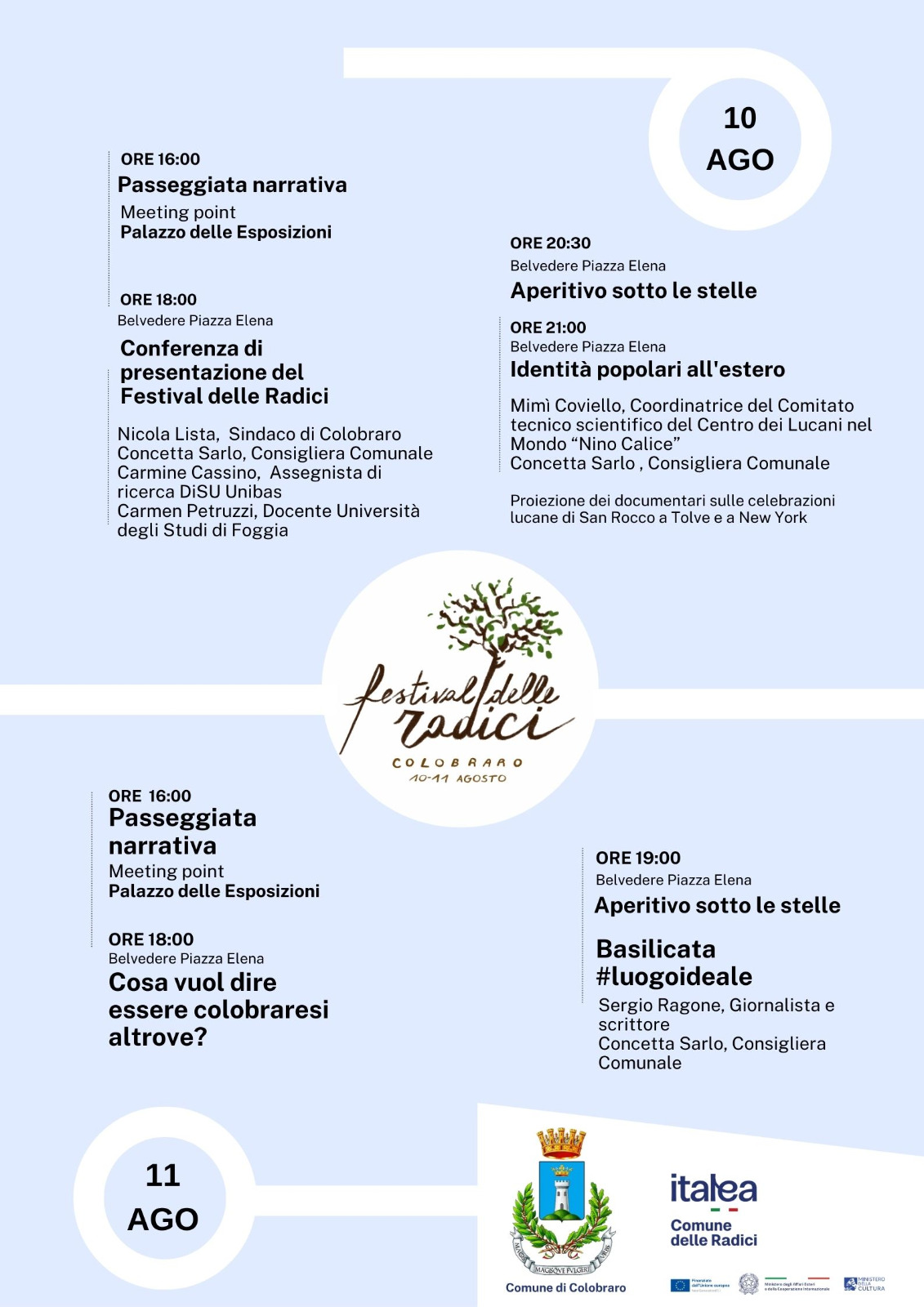 The program for the following day, Sunday 11, will include a new narrative walk at 4 p.m., at 6 p.m. the telling of expat testimonies titled “What does it mean to be colobraresi elsewhere?”, and will conclude at 7 p.m. with a dialogue between City Councilwoman Concetta Sarlo and writer and journalist Sergio Ragone on the concept of “Basilicata #luogoideal, based on the series of books “I Luoghi Ideali” (Universosud Edizioni) written by Ragone.