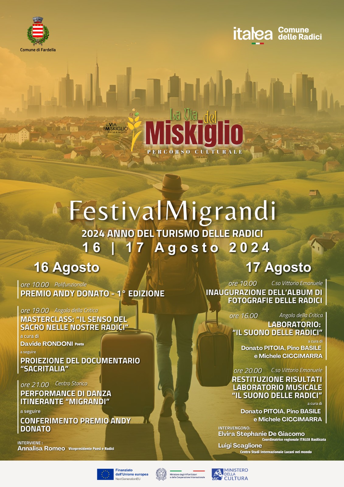 Migrandi Festival. Cultural event created to rediscover the origins of the Miskiglio Raskatielli Festival, included within the cultural route the Miskiglio way. It provides for the organization of cultural events that have migration as their theme. The festival is held on August 16 and 17 in Fardella and includes the following events: