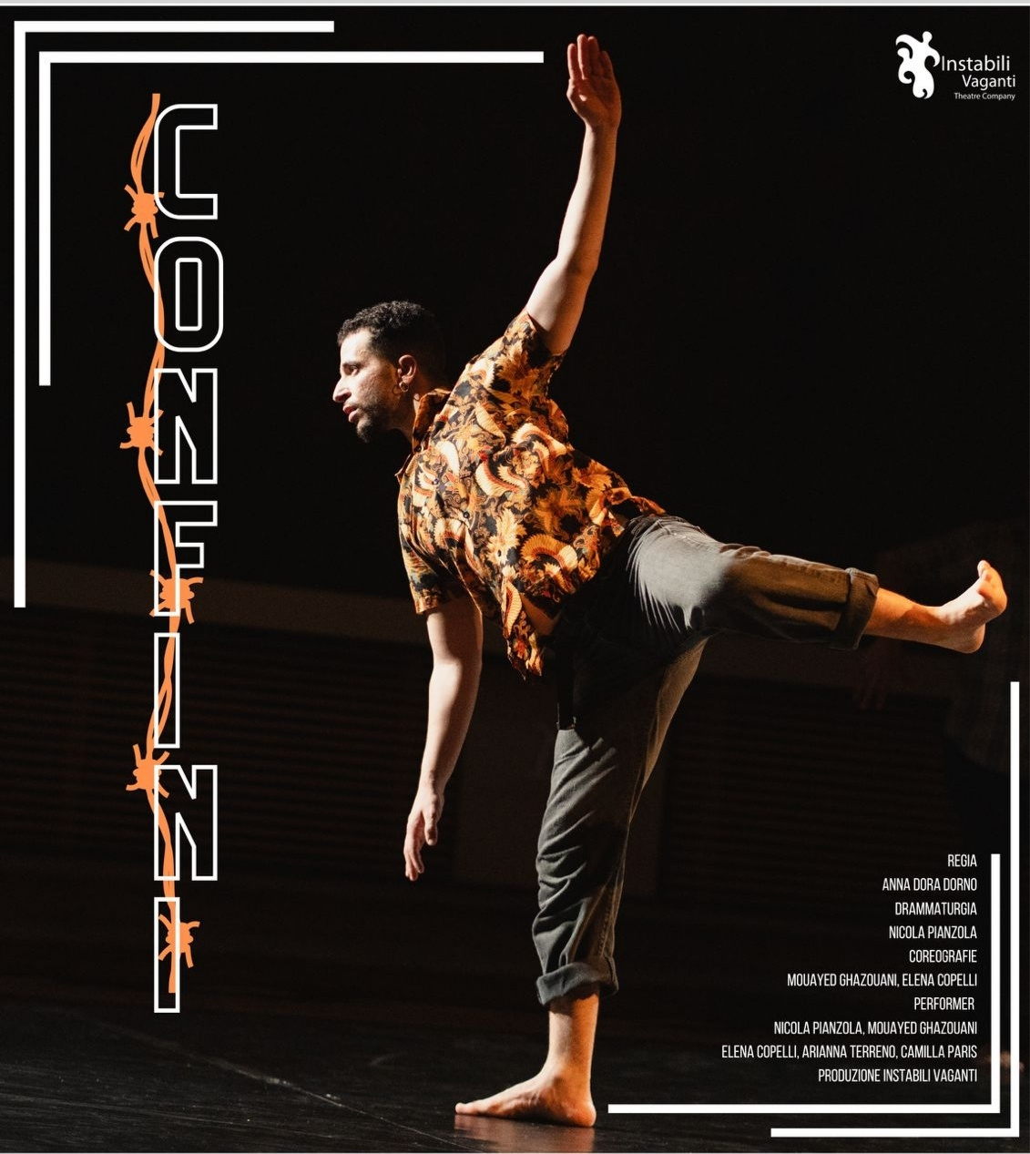 The performance is the result of a research process around the theme of the “border” developed by Instabili Vaganti, in the international project Beyond Borders, which involved young international dancers, performers and choreographers in the creation of a scenic structure in continuous evolution, which is composed of traditional and ritual performative elements from different cultures, actualized through theater and contemporary dance. The performers dig into their past, their cultural and performative traditions, to understand the present, to tell through gestures, actions, texts and songs, the limits they have had to overcome, the boundaries they have tried to cross to affirm their identity, and the new challenges that await them. Thus, interpersonal reflections emerge that link individual experiences to collective ones, dissecting problems that affect in particular the countries of origin of the artists themselves: