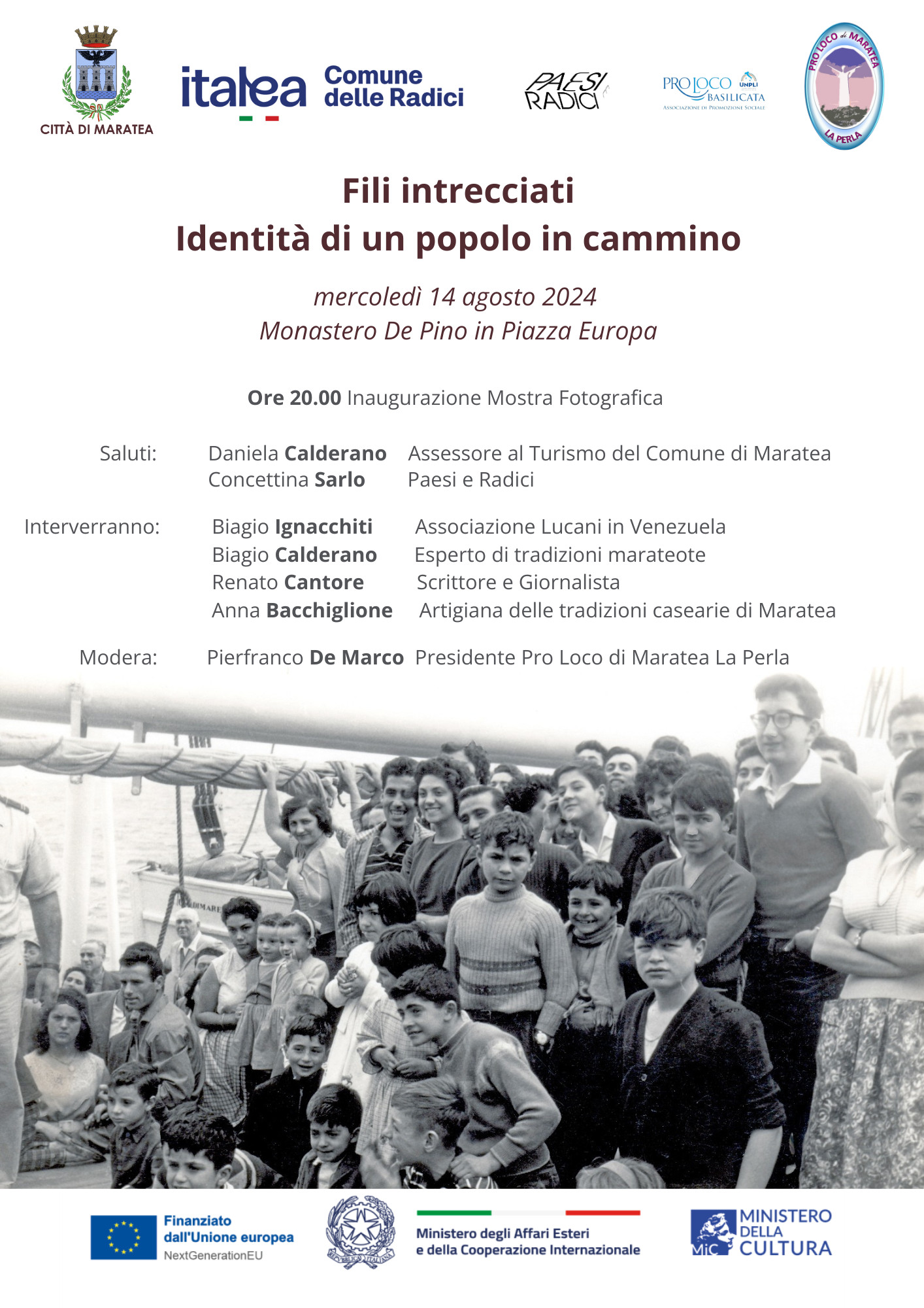 On Wednesday, August 14, the Photographic Exhibition “Interwoven Threads, Identity of a People on the Way” will be inaugurated in Piazza Europa and in the picturesque setting of the Pino Monastery in Maratea.