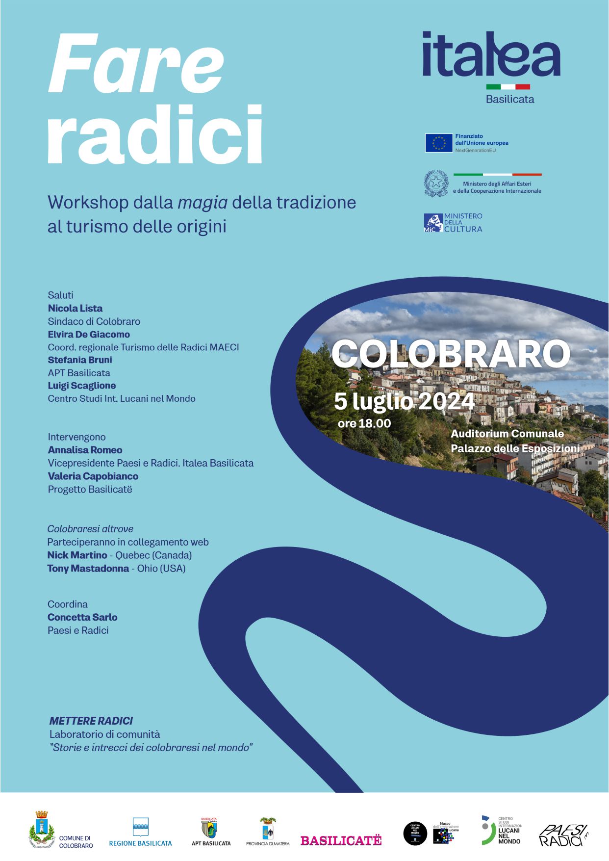 Están previstos los saludos del alcalde de Colobraro Nicola Lista, de la coordinadora regional del proyecto Turismo de las Raíces para el MAECI Elvira De Giacomo, de Stefania Bruni del APT Basilicata y de Luigi Scaglione para el Centro Studi Internazionale Lucani en el Mundo.