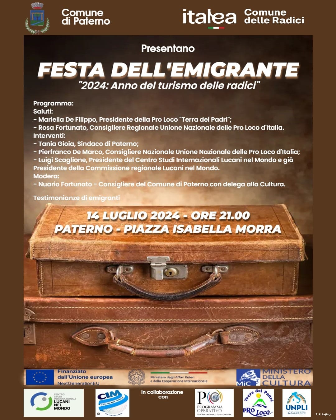 El evento representativo de la tradición paterna, que ha llegado a su 11ª edición, se enriquece este año con el homenaje a la figura conciudadana que, por diversas razones, ha dejado su tierra natal en busca de nuevas oportunidades de rescate. El evento pretende celebrar las delicias culinarias del territorio y las excelencias a nivel humano y profesional que nuestro país ha visto irse. Durante la noche se propondrán platos típicos de la tradición, acompañados de buena música del territorio y, siempre en un clima cordial, se celebrará la ceremonia de premiación dedicada a las personalidades que se han distinguido por sus méritos, en el extranjero.