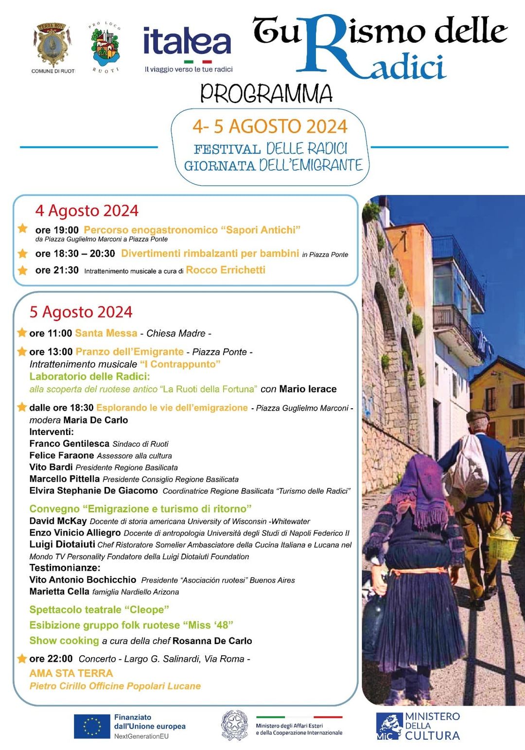 Oltre a un momento religioso, ci sarà una grande tavolata all’aperto dove sarà possibile degustare un menù tipico, preparato con ingredienti locali e secondo ricette tradizionali, un laboratorio che permette di scoprire il ruotese antico, “La Ruoti della Fortuna”, una sorta di gara sul dialetto ruotese. Il pomeriggio proseguirà con una conferenza durante la quale interverranno esperti del settore per discutere di emigrazione e accogliere i numerosi ruotesi che ritornano a Ruoti per le feste di San Donato e San Rocco, occasione per riunirsi con la famiglia e celebrare le tradizioni. Questo momento sarà allietato da uno spettacolo teatrale e dall’esibizione di danze tradizionali con il Gruppo Folk Miss’48.