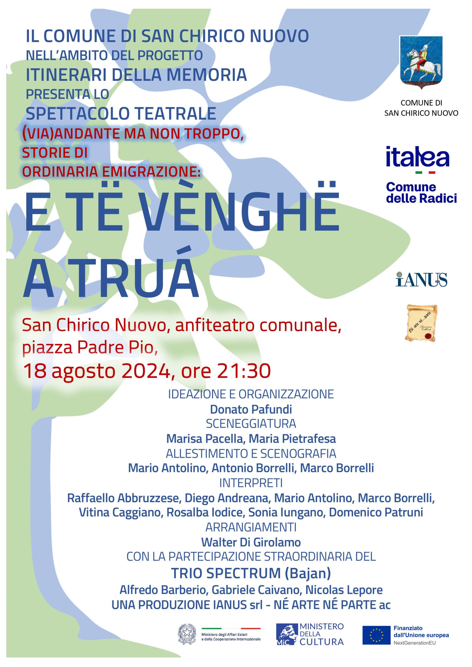 L’amministrazione comunale di San Chirico Nuovo, nel contesto delle celebrazioni del 2024, proclamato Anno delle Radici Italiane, attraverso il progetto “ITINERARI DELLA MEMORIA”, si propone di onorare e riflettere sulle profonde radici della nostra storia attraverso la messa in scena di uno spettacolo teatrale unico nel suo genere: “E TË VËNGHË A TRUÀ”.