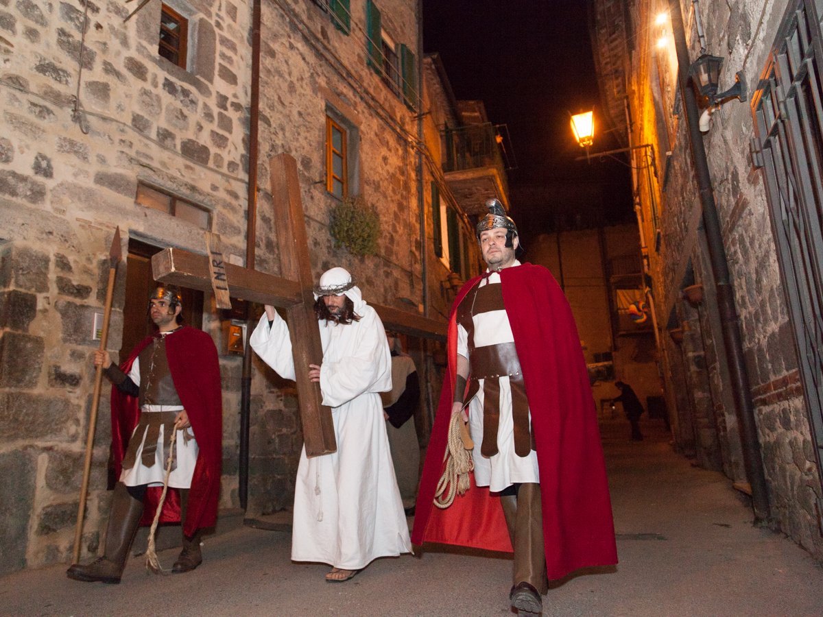 Entre as mais evocativas de todas, sobre a Amiata, nas celebrações da Semana Santa, está sem dúvida a Judeata de Radicofani, uma das mais antigas e certamente as mais belas de toda a Toscana. O evento começa na noite de Quinta-feira Santa, com a missa que comemora a Última Ceia e a abertura do túmulo de Cristo. Segue-se uma procissão de penitência, chamada de “escura” precisamente porque comemora a morte da divindade, da qual participam os 12 irmãos da congregação de Sant’Agata, de capas vermelhas, e os 12 membros da confraria da Misericórdia, de capas brancas. O número 12 evoca naturalmente o dos apóstolos.