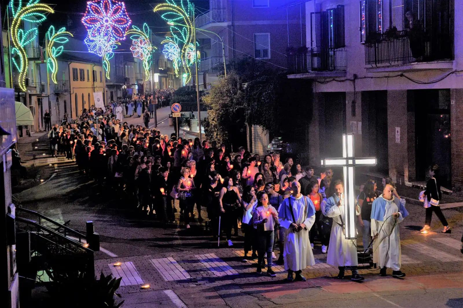 Característica é a procissão solene, animada por cantos, hinos e orações, que desfila pelas ruas da cidade, e adquire uma aparência harmoniosa, com os sons da banda, e sugestiva com o arranjo de inúmeras tochas e luzes ao longo de todo o percurso.