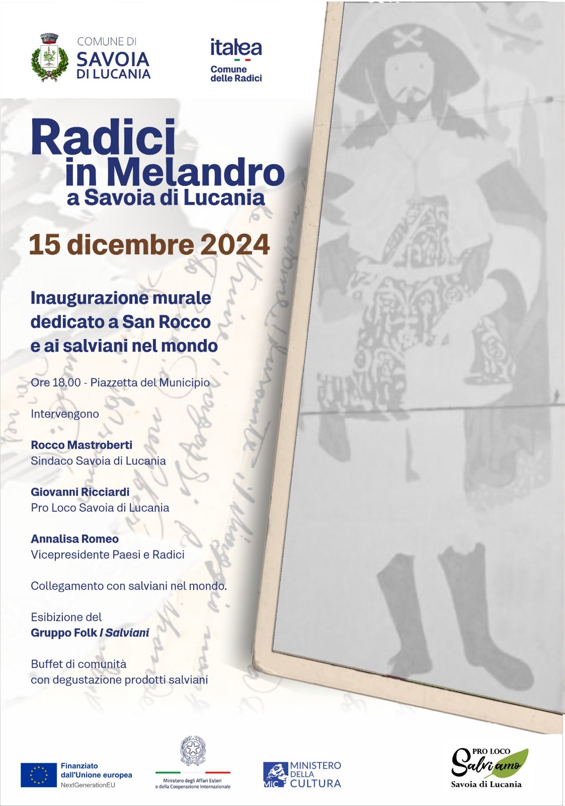 No dia 15 de dezembro, a Muralha dedicada a San Rocco e aos Salvi do mundo é inaugurada em Savoia di Lucania. O evento acontece no dia anterior à ‘edição de inverno’ da festa senhorial de San Rocco, e San Rocco é retratado no mural que faz uma viagem imaginária de Nova York a Savoy.